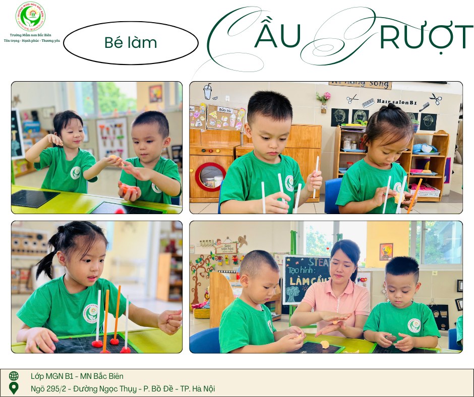 èn luyện kỹ năng cắt, dán, lắp ghép mà còn biết cách đo lường, tính toán độ dốc sao cho cầu trượt có thể hoạt động tốt. Các bạn nhỏ lớp MGN B1 đã có một buổi trải nghiệm hăng say với giờ học “Làm cầu trượt”.