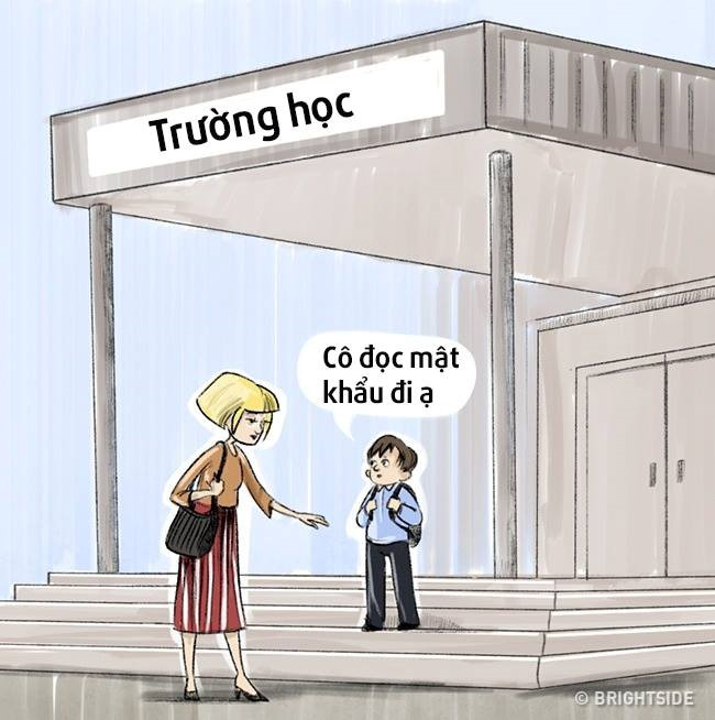 Bạn cũng có thể thỏa thuận với trẻ những mật khẩu chỉ riêng hai người biết. Khi ai đó tới đón trẻ mà không phải bạn, hãy nói với họ biết mật khẩu để họ nói lại với trẻ. Lúc đó trẻ sẽ biết đây là người có thể tin tưởng được. Nếu người nào không biết mật khẩu, dặn trẻ không nên đi đâu với họ.
