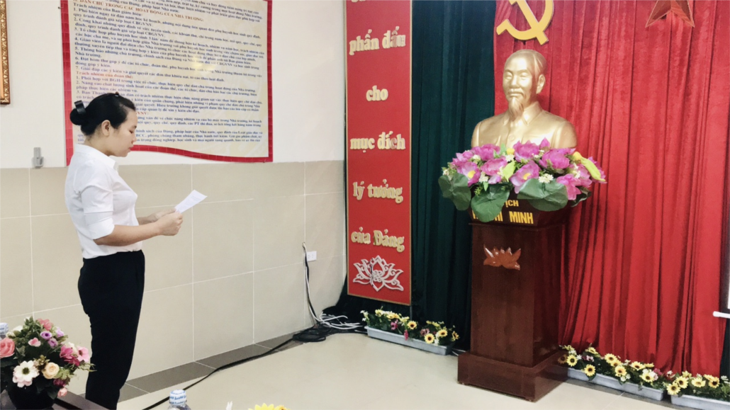 Trong không khí trang nghiêm khi nhận quyết định từ Bí thư Chi bộ, dưới cờ tổ quốc, cờ đảng và chân dung Chủ tịch Hồ Chí Minh cùng sự chứng kiến của đại biểu và Chi bộ, đồng chí đã tuyên thệ lời thề của người đảng viên Đảng Cộng sản Việt Nam, hứa sẽ tiếp tục phấn đấu để luôn xứng đáng là người đảng viên gương mẫu, đóng góp sức mình thực hiện thành công nhiệm vụ chính trị của Chi bộ, góp phần xây dựng Chi bộ ngày càng vững mạnh.
