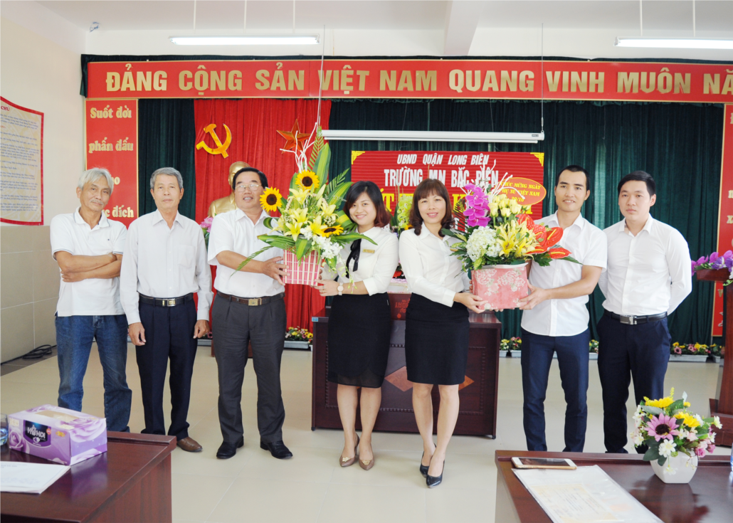 Đồng chí Nguyễn Thị Ngọc Thư - BTCB Hiệu trưởng nhà trường và Đồng chí Đặng Thu Hà - Chủ tịch Công đoàn Hiệu phó nhà trường lên nhận hoa từ các đoàn viên công đoàn