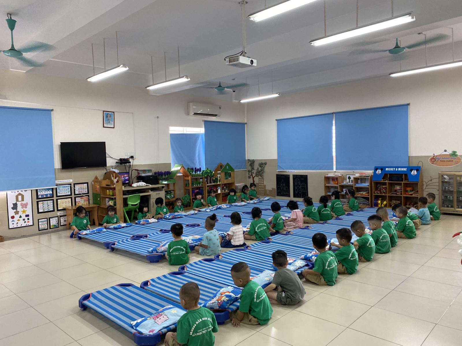Sau một buổi sáng với rất nhiều hoạt động được tham gia như: thể dục sáng, học, chơi, hoạt động ngoài trời, hoạt động góc...tiêu tốn khá nhiều năng lượng của trẻ thì khoảng thời gian ngủ trưa chính là thời điểm lý tưởng nhất với trẻ vì nó không những đem đến cho trẻ nguồn sức khỏe dồi dào mà còn đem đến cho trẻ tinh thần sảng khoái để tiếp thêm nguồn năng lượng cho các hoạt động buổi chiều. Muốn tạo được một giấc ngủ ngon cho trẻ thì giáo viên phải chuẩn bị các hoạt động giúp các con dễ đi vào giấc ngủ: sắp xếp phòng ngủ gọn gàng, sạch sẽ, thoáng mát về mùa hè, ấm áp về mùa đông. Trời nóng luôn có quạt, điều hòa giúp các con cảm thấy dễ chịu, có một giấc ngủ ngon. Trời lạnh có rèm che kín gió, điều hòa nóng, chăn ấm đưa các con vào giấc ngủ sâu. Bên cạnh đó, trước giờ ngủ mỗi ngày, các cô luôn đưa ra các hình thức khác nhau để các con ngủ ngon giấc: kể chuyện cổ tích cho trẻ, nghe nhạc nhẹ không lời, các làn điệu dân ca, các bài hát ru vùng miền...Thông qua giờ ngủ trưa, trẻ được củng cố thêm một số kỹ năng lao động tự phục vụ và giáo dục giới tính. Các bé được luân phiên tham gia trực nhật chuẩn bị giờ ngủ cùng cô như: trải chiếu, kê đệm, xếp gối giúp đôi bàn tay trở nên khéo léo và linh hoạt. Khi ngủ, các con được sắp xếp nằm riêng theo dãy bạn trai và bạn gái nhằm giáo dục cho các con ý thức về giới tính.