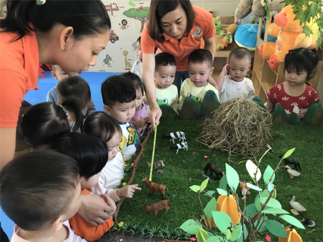 Các bé cùng cô nhận biết phân biệt trứng to - nhỏ và còn biết giúp các Bác nông dân phân loại trứng to - nhỏ và hai chiếc, ổ to thì để quả trứng to, ổ nhỏ thì để trứng nhỏ. Tiếp đó các con được chọn quả cam to - quả dâu tây nhỏ, bạn nào cũng thích thú vì đó là quả mà do chính tay cô và các con cùng làm trước đó.