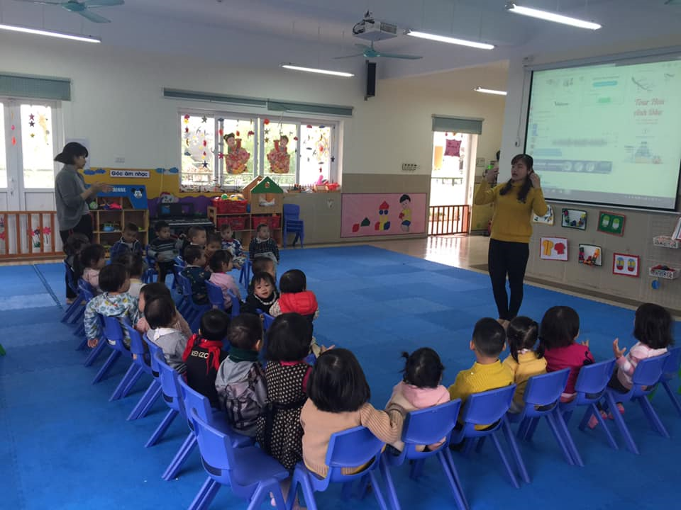 Cô và trẻ cùng nhau trò chuyện về nôi dung bài hát
