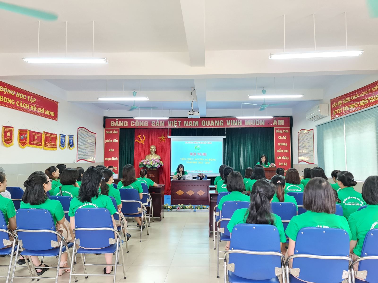 Đến dự và chỉ đạo Hội nghị: Đ.c Nguyễn Thị Ngọc Thư - BTCB - HT nhà trường, Cùng toàn thể Cán bộ, viên chức Trường MN Bắc Biên Hội nghị viên chức, người lao động là dịp quan trọng để cán bộ, giáo viên, nhân viên trong nhà trường được nói lên tiếng nói, suy nghĩ, nguyện vọng của bản thân cũng như của nhóm, tổ chuyên môn; tham gia đóng góp ý kiến cho Báo cáo kiểm điểm thực hiện nghị quyết Hội nghị viên chức, người lao động năm học 2021-2022; phương hướng, nhiệm vụ trọng tâm năm học 2022- 2023. Tất cả các ý kiến tham gia đều có ý nghĩa xây dựng, thể hiện tinh thần trách nhiệm xây dựng nhà trường ngày càng phát triển.